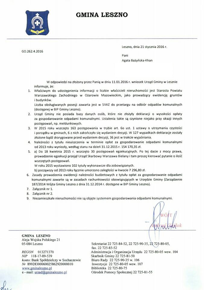 Pamiętacie nasze pismo do Gminy z prośbą o informację w sprawie śmieci? Wczoraj dostaliśmy odpowiedź. Jak się okazało, nie wszystkimi danymi Gmina dysponuje. Zapytamy dalej. Na podstawie tego, co nam przekazano, widać jednak, że ze ściągalnością nie jest najlepiej. 154 tysiące zaległych należności to naprawdę sporo. Dokumenty, do których w piśmie odesłała nas Gmina, wskazują, że w 2014 r. przewidywano odbieranie odpadów od ok. 9600 mieszkańców. Dwuzłotowa podwyżka opłaty za śmieci (która weszła w życie z dniem 1 stycznia br.) powinna więc zwiększyć wpływ do Gminy o jakieś 230 000 zł rocznie. Oczywiście będzie tego mniej. Wspomniane 154 tysiące niezapłaconych należności to 535 mieszkańców, którzy nie zapłacili ani złotówki przez ostatnie 3 lata. Ci ludzie nie zapłacą najpewniej i teraz. Zastrzyk gotówki zapewne załata powstały brak. Pytanie tylko, czy rozwiązanie, zgodnie z którym płacący regularnie mają pokryć zobowiązania uchylającej się reszty, jest w porządku? Zwłaszcza że z przekazanych danych nie wynika, by Gmina naprawdę dołożyła wszelkich starań, by wyegzekwować wspomniane należności od tych, którzy opłaty uiszczać nie chcą.
