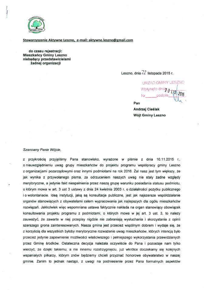 W związku z pominięciem przez Wójta Gminy Leszno naszych uwag do projektu programu współpracy z organizacjami pozarządowymi i innymi podmiotami na rok 2016, złożyliśmy dziś w urzędzie gminy pismo. Intencją naszą jest doprowadzenie do większej otwartości władz gminy na głos mieszkańców. Otwartość taka i dialog, prowadzony np. w ramach konsultacji społecznych, w naszej ocenie przyczynią się tylko do podniesienia jakości tworzonego w gminie prawa.