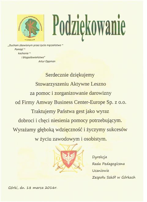 Od zeszłego roku pilnie pracowaliśmy, by wykorzystać szansę, jaką dała nam firma Amway Business Centre Europe Sp. z o.o. i pracujący w niej nasz stowarzyszeniowy kolega Marcin Kłódkiewicz. Dzięki naszym staraniom do Zespołu Szkół w Górkach w gminie Leoncin dwa tygodnie temu trafiło 30 laptopów i 15 komputerów stacjonarnych. Bardzo się cieszymy, że mogliśmy w taki sposób pomóc dzieciom z tej szkoły. Mamy nadzieję, że komputery będą dobrze służyły młodzieży w Górkach. Podziękowania dla Firmy Amway za szczodrość i Marcinowi za koordynowanie projektu. Bardzo też dziękujemy dyrektor Szkoły Jolanty Amine i koordynatorce projektu ze strony szkoły Renacie Nowickiej.